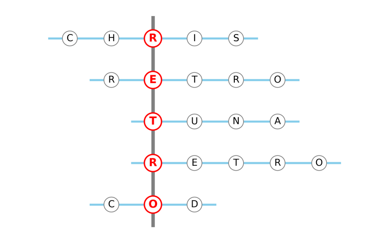 retro(长度 5),第 2 个字符是'e',等于retro的第 2 个字符; - 肋骨 3: